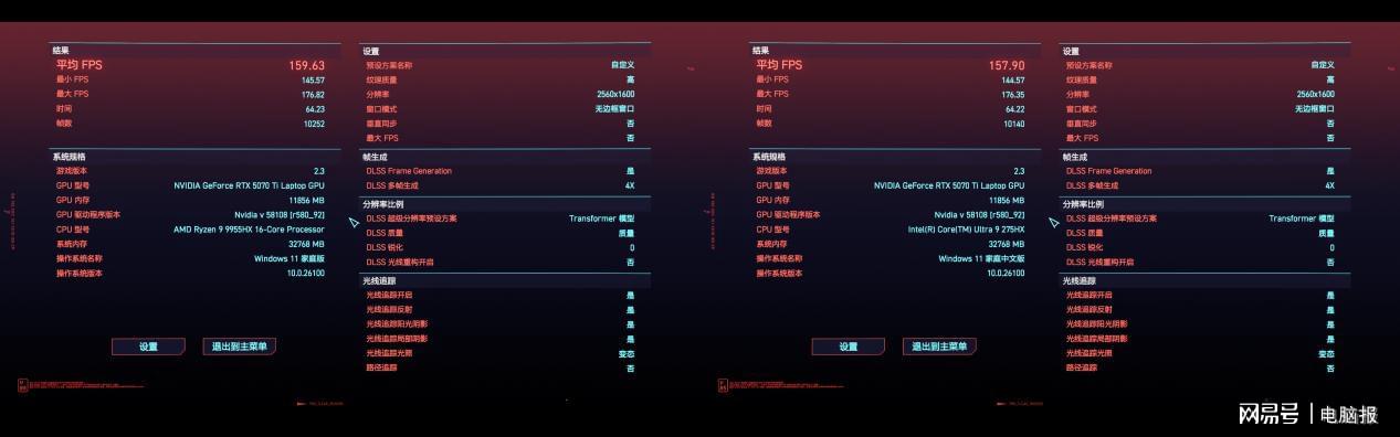 为了方便对比,我们还选择了一款同样搭载满血RTX 5070 Ti独显的酷睿Ultra 9 275HX电竞本作为参考,它也拥有16英寸屏幕、2560×1600分辨率、32GB DDR5 5600内存,与机械革命蛟龙16Pro 2025相同,从而保证准确反映出处理器的性能差异。游戏分辨率统一设置为两款笔记本屏幕的物理分辨率2560×1600。