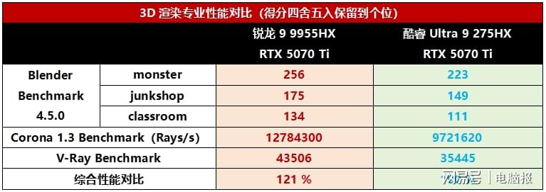 锐龙9 9955HX和酷睿Ultra 9 275HX都是拥有超多核心的旗舰U,因此除了玩游戏之外用来完成一些生产力工作也是不错的选择。那么在吃多核性能的3D渲染类生产力应用中它们谁更强呢?从实测来看,在Blender三项测试中锐龙9 9955HX领先酷睿Ultra 9 275HX的幅度分别为15%、17%和21%,可以说是大获全胜。在Corona 1.3测试中,锐龙9 9955HX领先酷睿Ultra 9 275HX的幅度为32%,完全高出了两个档次。在V-Ray测试中锐龙9 9955HX领先酷睿Ultra 9 275HX的幅度为23%,也是遥遥领先。
