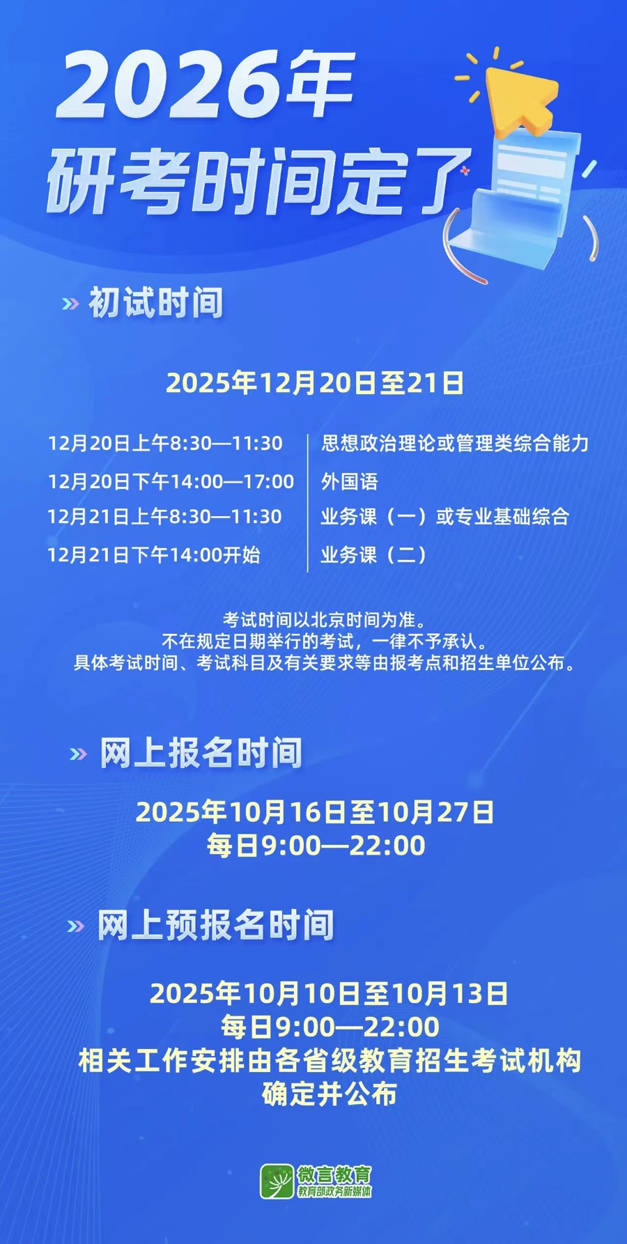 《规定》明确,2026年全国硕士研究生招生初试时间为2025年12月20日至21日。网上报名时间为2025年10月16日至10月27日(网上预报名时间为2025年10月10日至10月13日,相关工作安排由各省级教育招生考试机构确定并公布),每日9:00—22:00。网上报名结束后,各省级教育招生考试机构将组织网上确认工作,对考生报名信息进行审核。所有考生均须在规定时间内参加网上报名和网上确认,逾期不再补办。