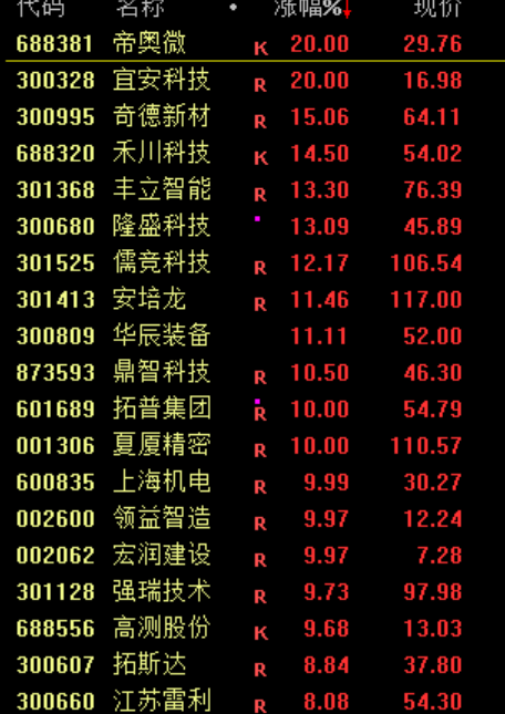 机器人概念股再度爆发,多股涨停。消息面上,上海市经济和信息化委员会等三部门19日联合发布《上海市加快推动“AI+制造”发展的实施方案》。其中提出,加快机器人应用。支持电子信息、汽车、装备等重点行业面向重复性强、危险性高、对健康存在危害的工作场景部署应用工业机器人,提高生产效率和生产安全性。推动智能机器人在装配、焊接、喷涂、物料搬运等环节开展规模化应用。推动钢铁、船舶等行业打造人机协同智能制造作业单元,实现复杂工序无人化。制定工业场景人形机器人安全性可靠性检验检测方法,推动产品“持证上岗”。
