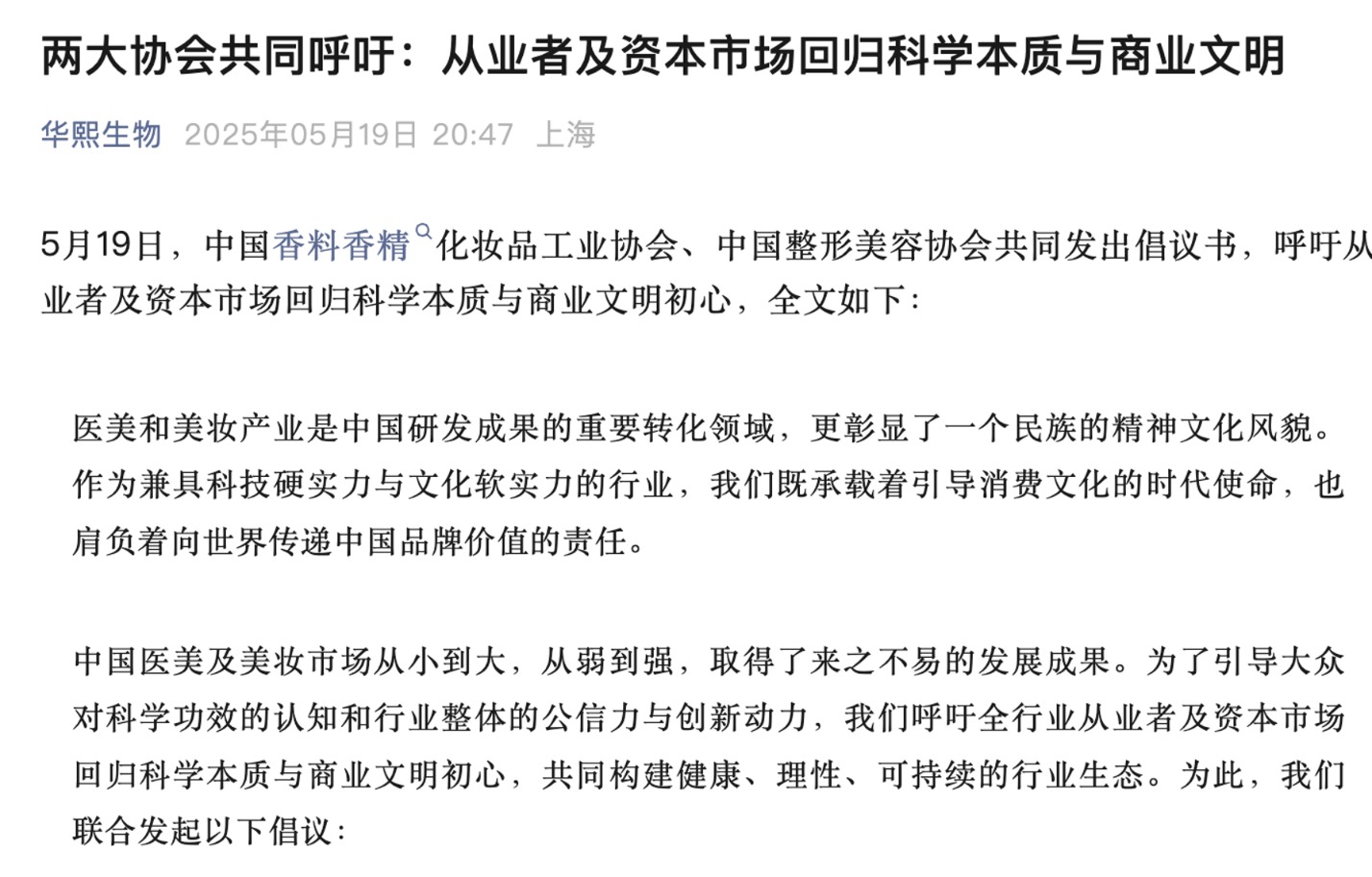 华熙生物进一步指出,此类研报结论被自媒体和社交媒体广泛传播,形成资本市场与消费市场的“舆论共振”,导致投资者和消费者对玻尿酸产业的信心受损。其矛头直指券商研报背后的资本逻辑:“浮躁资本为追逐新题材,刻意构建‘玻尿酸过时论’,试图用‘概念切换’掩盖中国产业升级的真实需求”。
