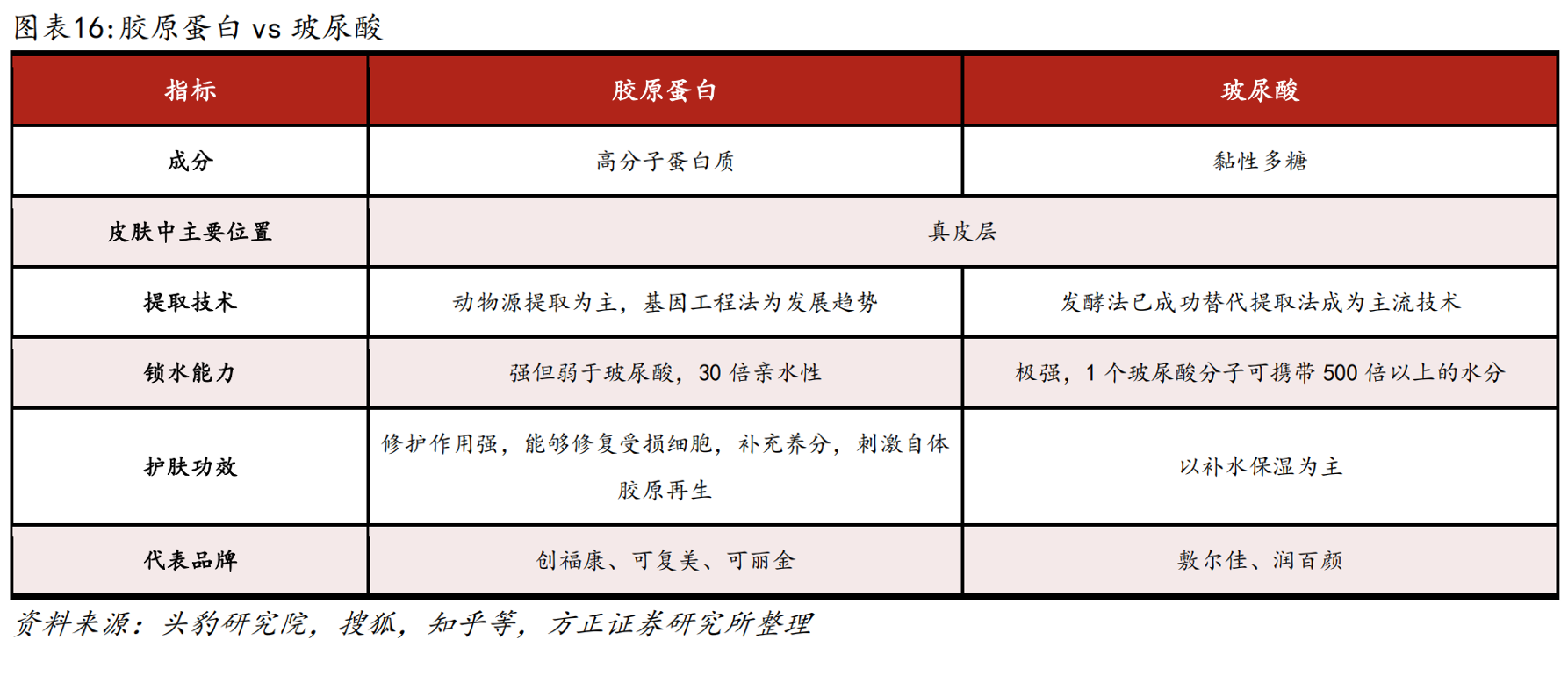 信达证券:与透明质酸钠相比,活性胶原蛋白本身可为皮肤提供胶原蛋白,达到支撑作用,同时刺激成纤维细胞产生胶原蛋白,增强肌肤弹性,达到抗衰效果。
